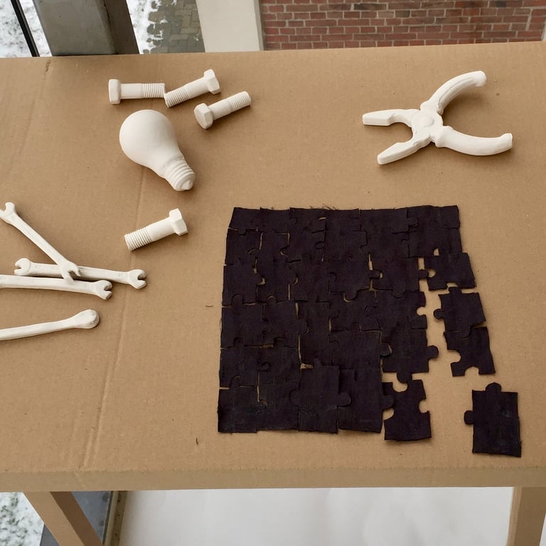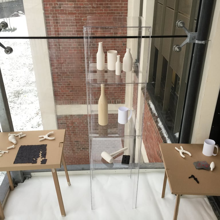 Recollection translates everyday objects and furniture into archetypal forms, stripping them of personal specificity to explore how meaning persists when memory is abstracted. By using unconventional materials — wood, clay, steel, wax, cardboard, and fabric — I recontextualize familiar forms, inviting viewers to recognize them through collective experience rather than personal narrative.